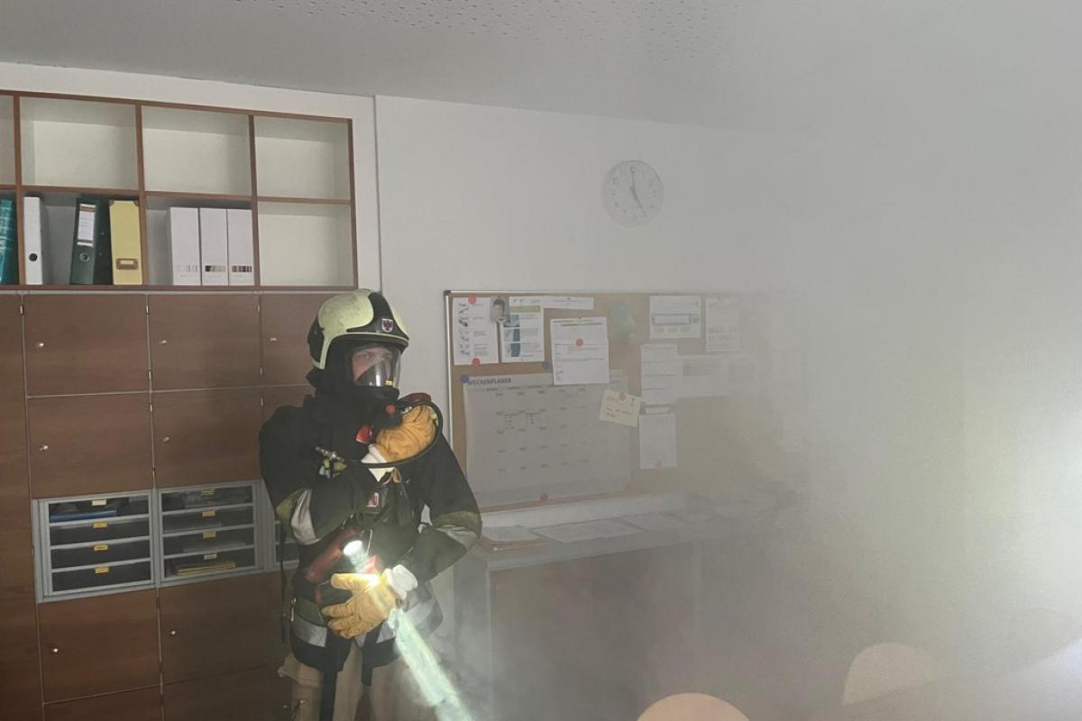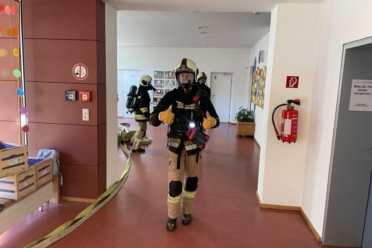 Beim Eintreffen unserer Mannschaft stellte sich ein Brand im ersten Stock heraus. Aufgrund der starken Verrauchung im Stiegenhaus konnte eine Klasse das 2 OG nicht mehr selbstständig verlassen. Die betroffene Klasse musste von unseren zwei Atemschutztrupps und der Drehleiter evakuiert werden. Im weiteren Übungsverlauf wurden die restlichen Räume noch durchsucht und mittels Überdruckbelüfter entraucht.