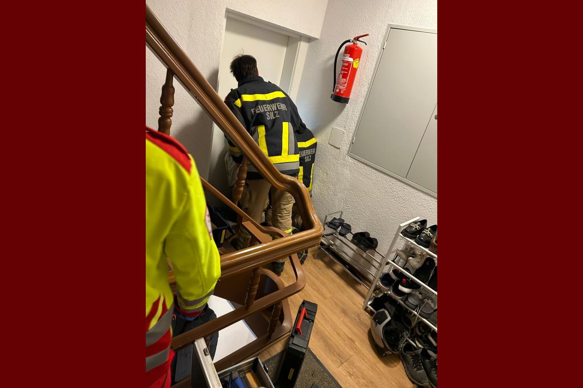Daraufhin wurden sowohl der Rettungsdienst als auch die Feuerwehr Silz per Sammelruf alarmiert. Nach einer kurzen Lageerkundung stellte der Einsatzleiter fest, dass sich die betroffene Person im 1. Obergeschoss befand. Parallel wurde versucht, sich sowohl über die Wohnungstüre als auch mittels Steckleiter über ein gekipptes Fenster Zugang zur Wohnung zu verschaffen. Aufgrund der Dringlichkeit der Situation öffnete die Feuerwehr schließlich die Wohnungstüre von außen, um rasch zur Person vorzudringen.