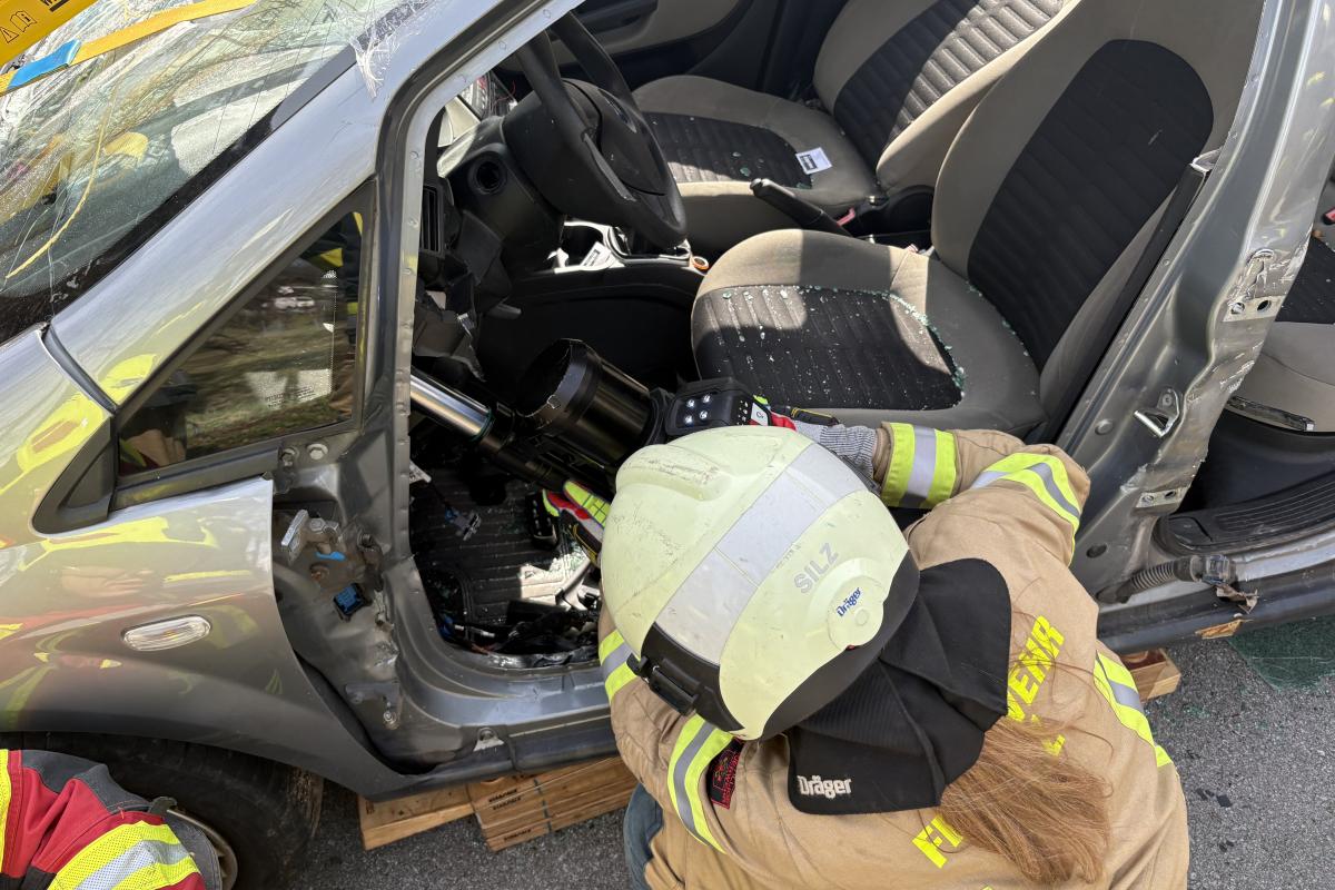 Am Vormittag standen rund drei Stunden theoretische Ausbildung auf dem Programm. Dabei wurden grundlegende Einsatztaktiken bei Verkehrsunfällen behandelt – von der Erkundung der Lage über die Erstmaßnahmen bis hin zur patientenorientierten Rettung. Ein besonderer Schwerpunkt lag auf dem Arbeiten mit Rettungskarten sowie auf den Herausforderungen durch alternative Antriebssysteme wie Elektro- und Hybridfahrzeuge.