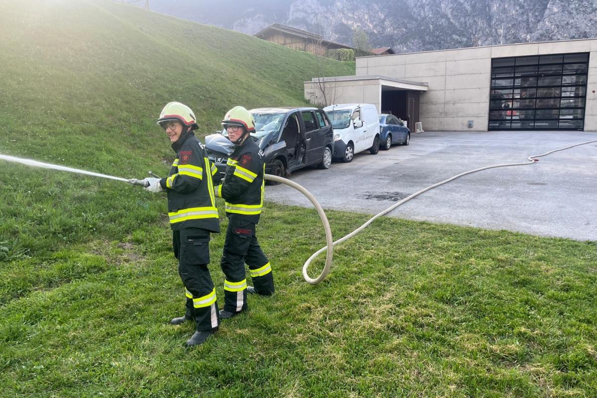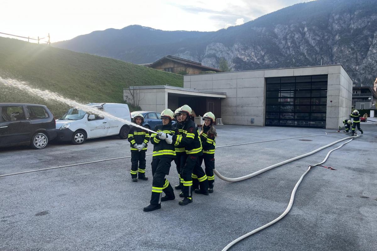 Anschließend wurde ein Löschangriff mit einem B-Strahlrohr beübt um den Unterschied zwischen B und C Strahlrohr zu zeigen.