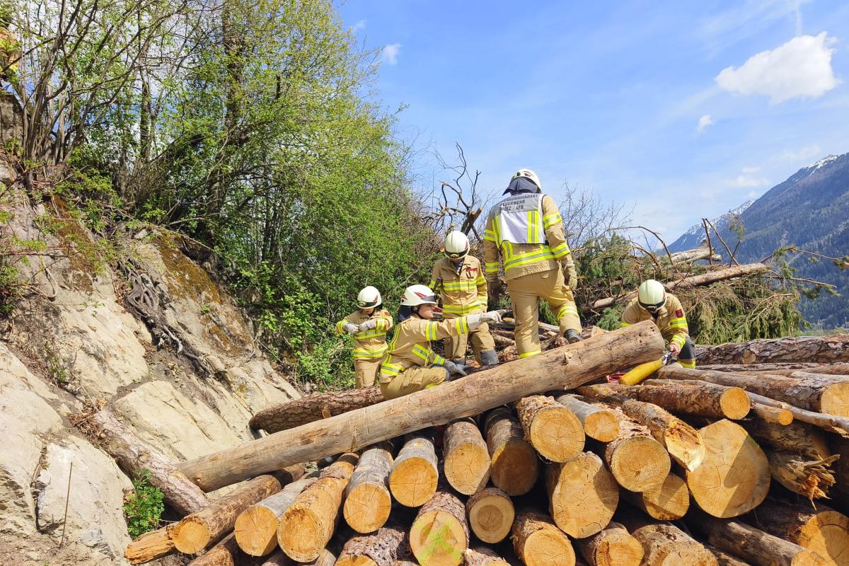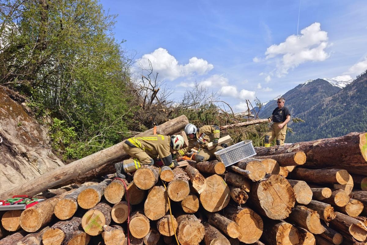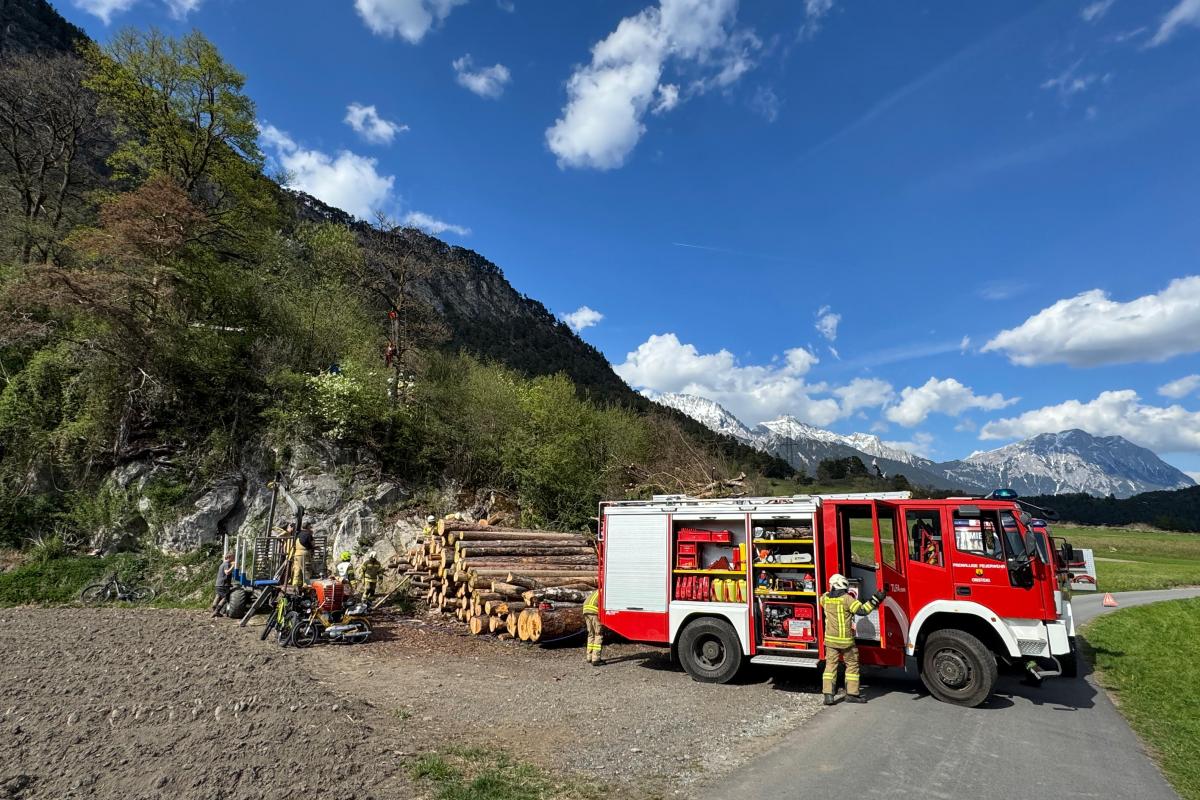 Ein Paragleiter war in einem Baum hängen geblieben. Ein Holzarbeiter, der helfen wollte, wurde dabei selbst verletzt und unter einem Holzhaufen eingeklemmt. Mithilfe von Hebekissen musste der Holzhaufen angehoben werden, um den Arbeiter zu befreien. Parallel dazu wurde der Paragleiter von der zweiten Feuerwehr aus dem Baum gerettet.