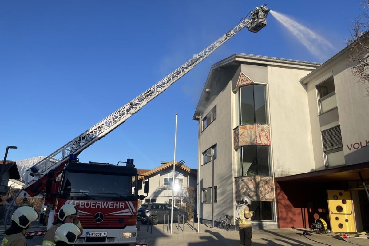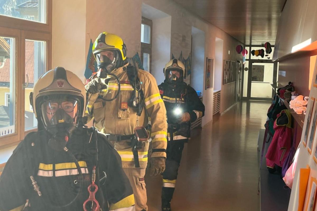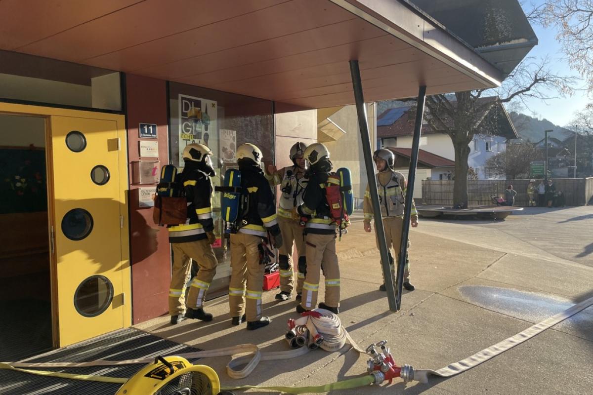 Beim Eintreffen unserer Mannschaft stellte sich ein Brand im ersten Stock heraus. Aufgrund der starken Verrauchung im Stiegenhaus konnte eine Klasse das 2 OG nicht mehr selbstständig verlassen. Die betroffene Klasse musste von unseren zwei Atemschutztrupps und der Drehleiter evakuiert werden. Im weiteren Übungsverlauf wurden die restlichen Räume noch durchsucht und mittels Überdruckbelüfter entraucht.