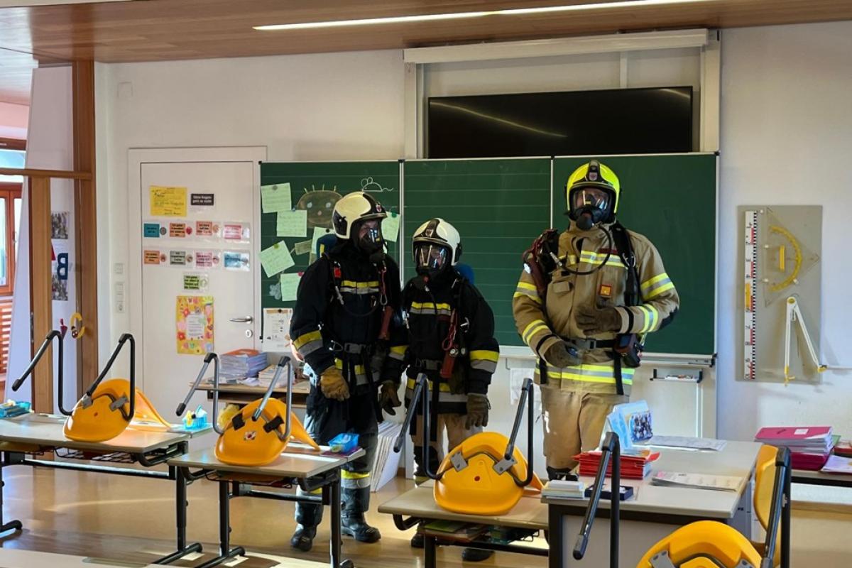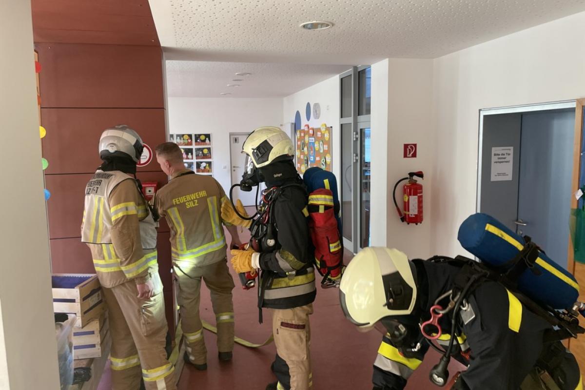 Die Aufgaben der Fahrzeuge: KRF-S-> Einsatzleitung; TLFA 3000/200-> Innenangriff und Evakuierung der Klasse; DLK-> Personenrettung und Brandbekämpfung; RLF-T-> Innenangriff und Überdruckbelüftung; KLF-> Wasserversorgung vom Dorfbach; SRF und MTF-> Personenrettung vom Vordach,