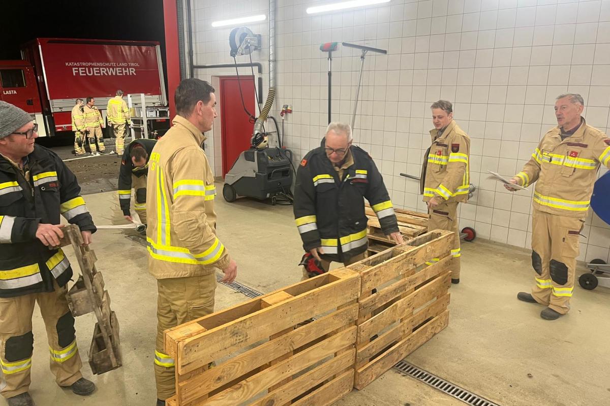 Bei Station 2 wurde geübt, wie man im Schadensfall verhindern kann, dass sich Wasser weiterverbreitet, beispielsweise wenn es in einen Keller eindringt. Dazu wurde mithilfe von Folie, Paletten und Sandsäcken eine Schutzwand errichtet.